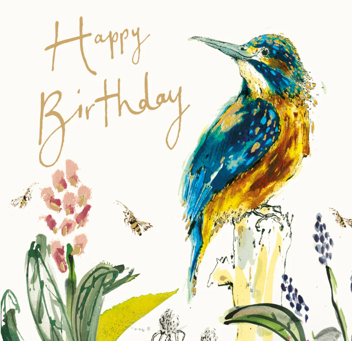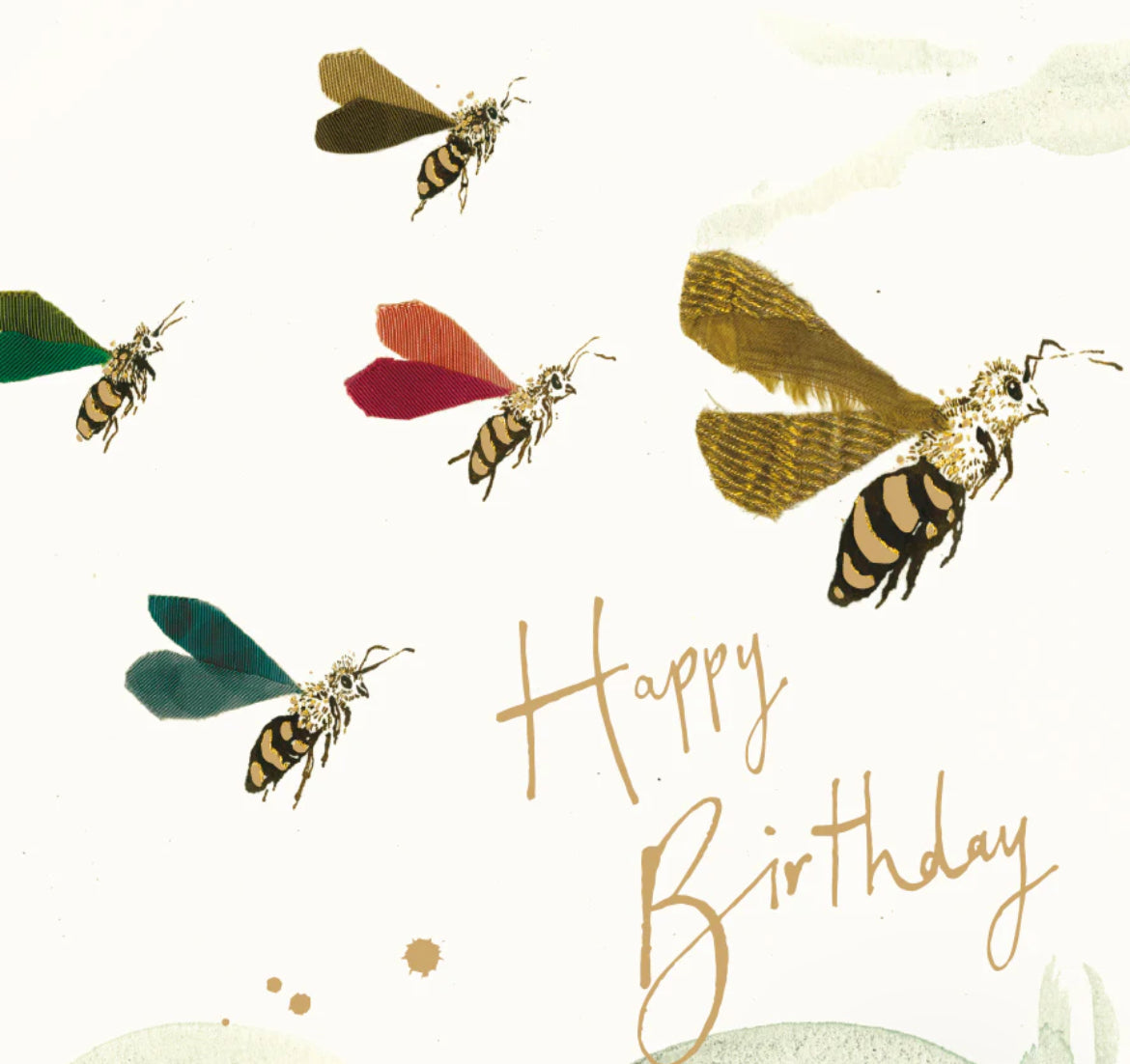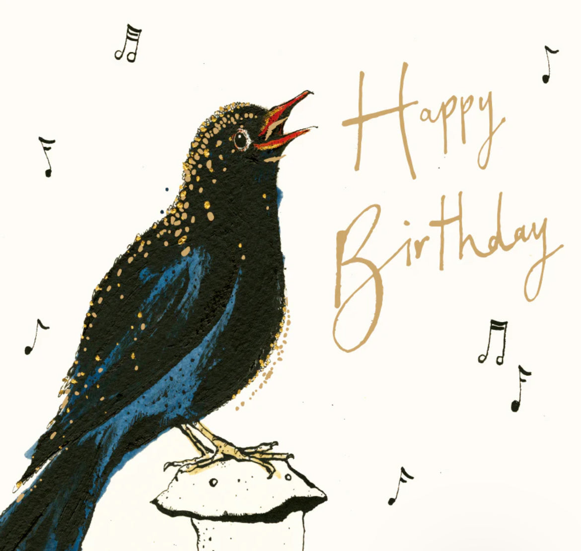 A gold foil embossed card illustrated with a happy signing Blackbird and the handwritten text...