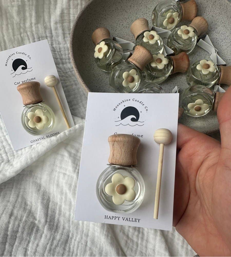 A unique and giftable floral design car perfume You know how car air freshners are usually too synthetic, strong, and barely last a week? Our best selling car perfumes actually smell great and last for months! Perfect for anyone who loves unique , stylish designs adding a touch of elegance to the car. A big hit in gift stores. Scent: Happy Valley is a gorgeous blend of ripe strawberries with notes of champagne, leaf green and red roses. It’s sweet aroma with fruity undertones is inspired by the herbaceous foliage found in Orkney’s very special ‘Happy Valley’. 🌟🌟🌟 How to use: 1. Shake well. Remove bottle lid and carefully remove the clear plastic stopper from the top of the bottle. 2. Replace and tighten wooden bottle lid. 3.Put the wooden reed through the whole 4.Clip on to your car radiator and enjoy!