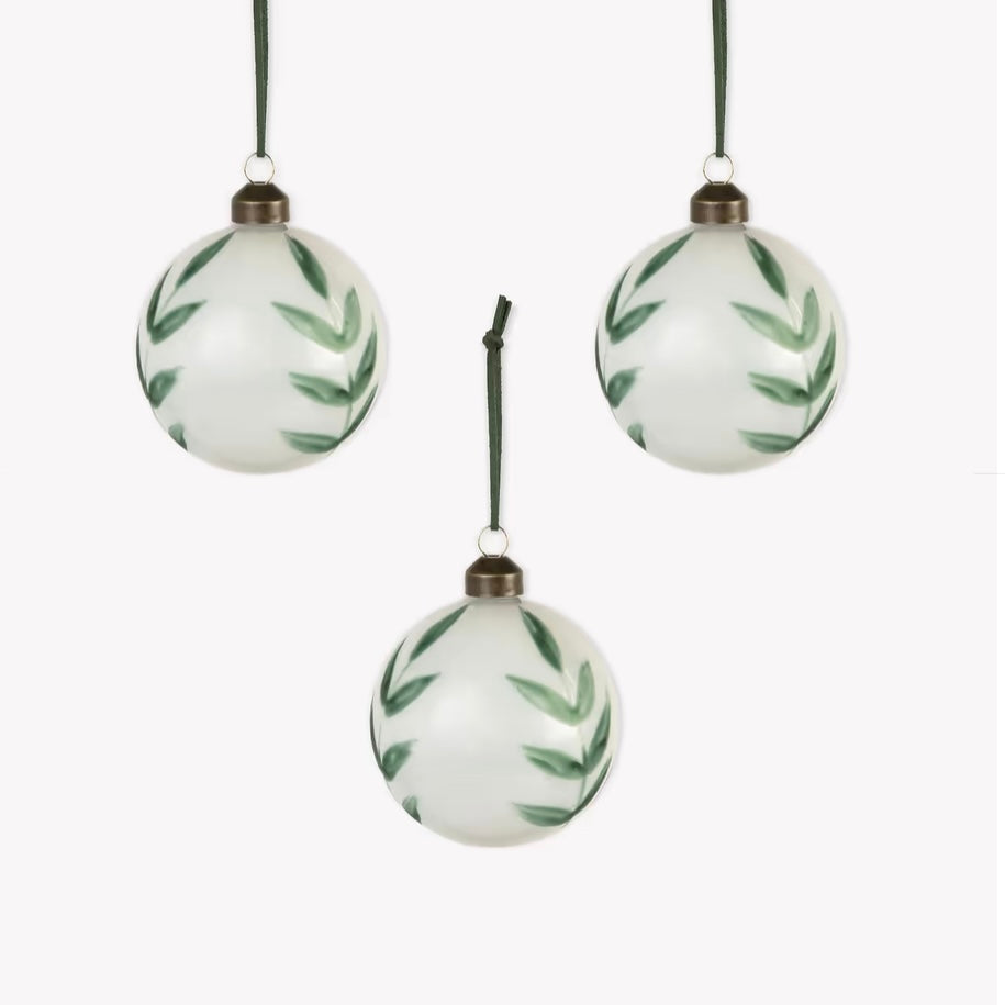Each of our set of three exquisite Kemble Vine Baubles features a delicately hand-painted vine design in rosemary green on a pearlescent glass bauble, bringing a shimmering lustre to the Christmas tree. Finished with an antique brown metal topper and a dark green leather-look hanging loop ready to thread onto the branches, this beautiful bauble will look smart paired with other glass baubles in our collection. Continue the theme on the Christmas dinner table with our matching set of six Kemble Vine Mini Bauble Place Settings in rosemary green.
