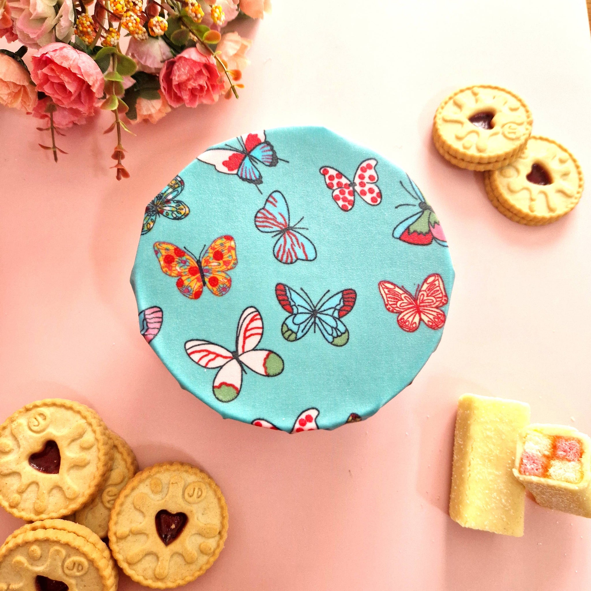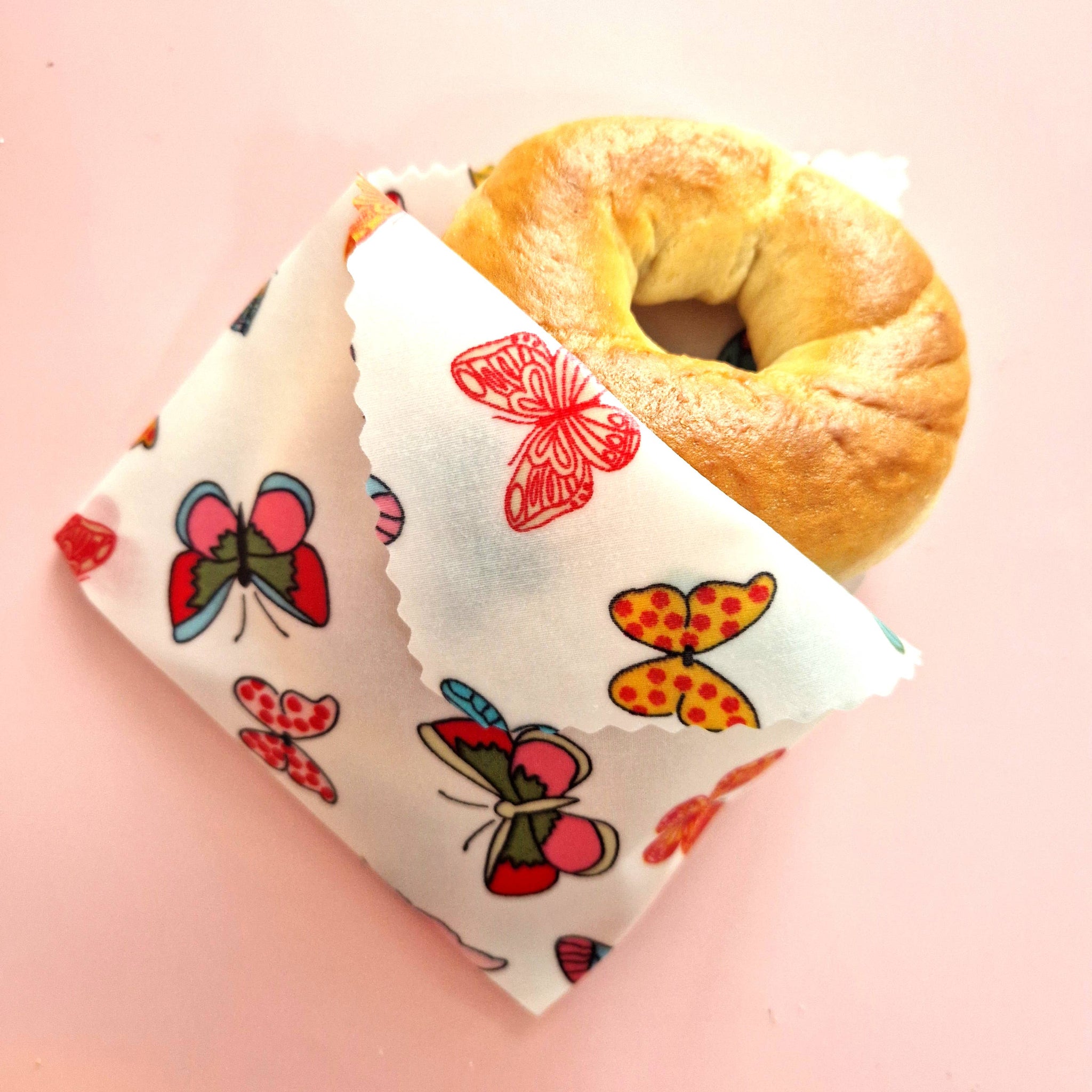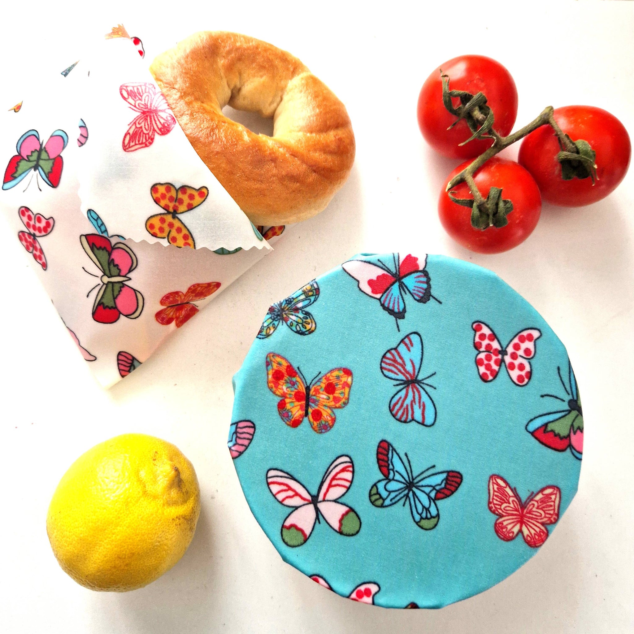 Our Butterfly Beeswax Wraps Pack of 3 includes one large (30cm / 12in), one medium (25cm / 10in), and one small (20cm / 8in) wrap, featuring a beautiful butterfly design. Ideal for wrapping sandwiches, cheese, fruit, leftovers, and covering bowls.