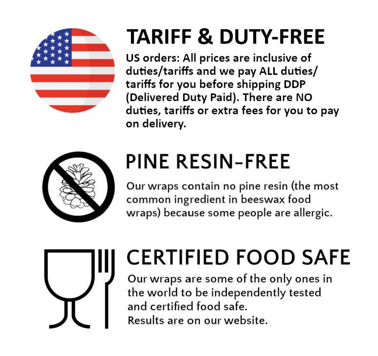 Each set is 100% handmade in our small UK family business using award‑winning, sustainable production methods. Our wraps are certified food safe, pine resin‑free, and jojoba oil‑free, making them suitable for people with sensitivities.