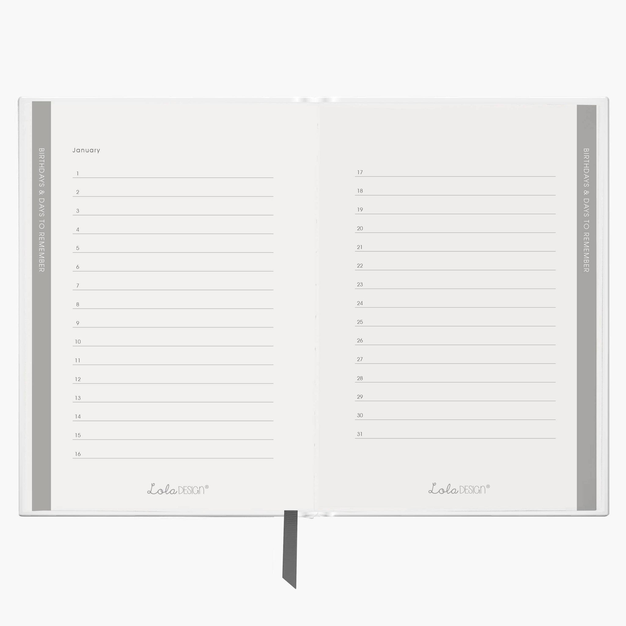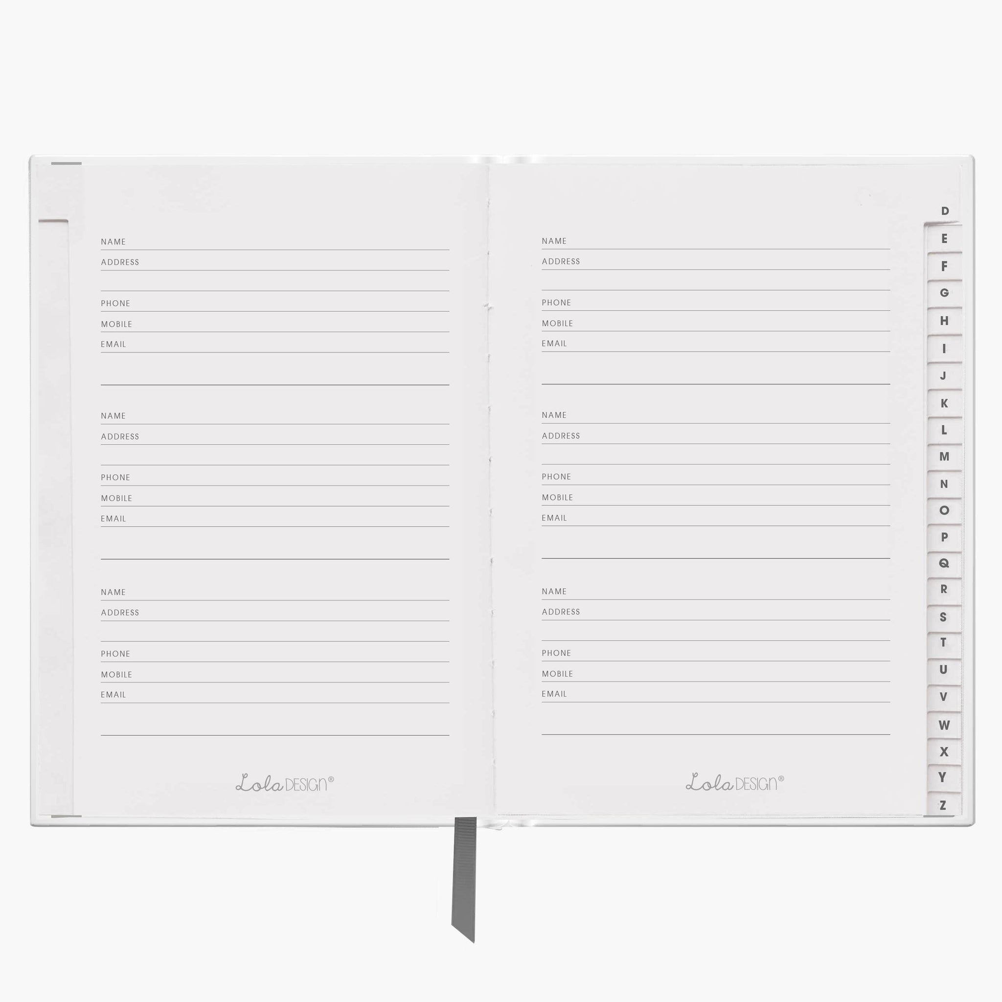 A-Z alphabet tabs for all your addresses Month by month birthday and days to remember pages Satin ribbon marker