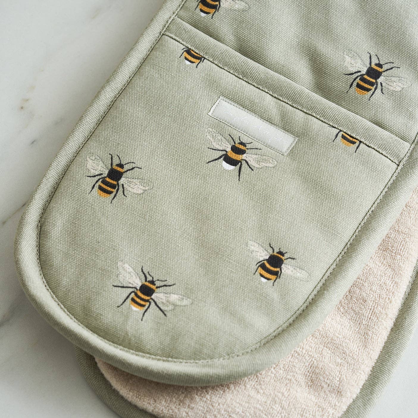 Description Brighten up your kitchen with a practical pair of double oven gloves covered in stylish bees on a pale green background. The reverse of the glove and inside each hand pocket has a polyester thermal layer for extra protection and there is also a handy 'loop' in the middle of the glove, so you can hang it up in your kitchen. * L 84 x W 18cm * Made from 100% cotton * Polyester thermal layer * Hanging loop * Pattern may vary slightly * Coordinating items are available in the Bees collection Care Guide * Wash at 30 degrees * Iron on a medium setting * Do not tumble dry * Do not dry clean * Do not bleach