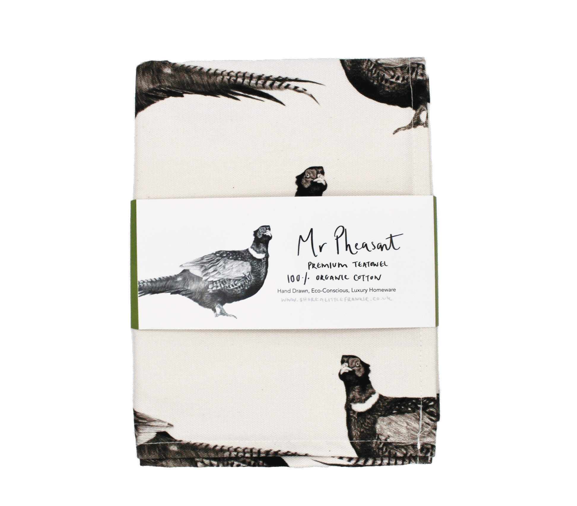 Mr Pheasant 100% organic cotton essential tea towel, printed from a hand drawn design. Perfect everyday use or makes a fabulous gift for countryside or game bird lovers. Beautifully packaged. 100% Organic Cotton Material Loop for hanging Sustainable alternative. Unbleached for more eco-conscious manufacturing Beautifully packaged with bellyband Wash up to 40* Manufactured in the UK & Hand Packed In Lucy's Dorset Studio Any questions please contact sharealittlefrankie@hotmail.com or reach out to us on our social media sharealittlefrankie
