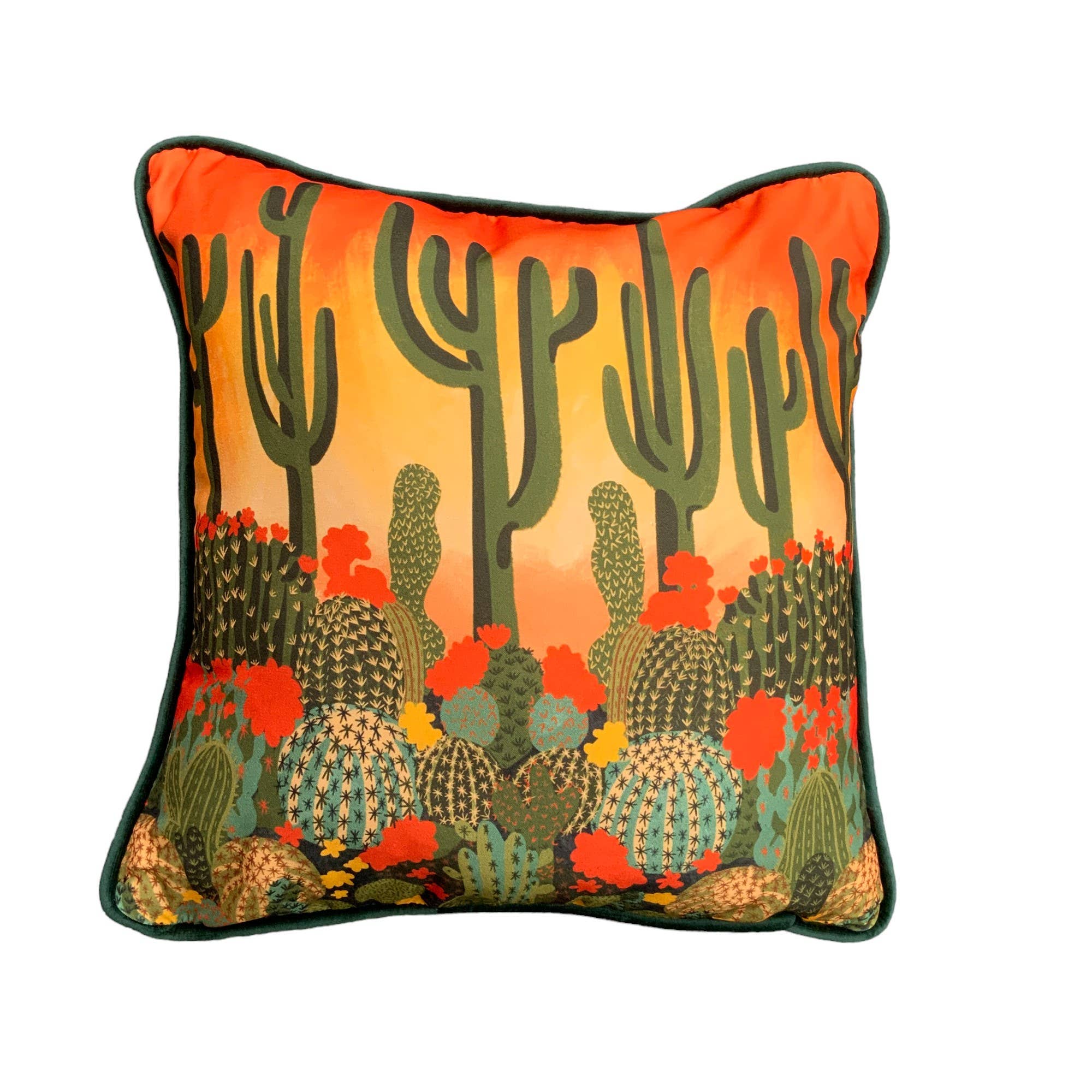A handmade cushion cover by The Neighbourhood Threat. Featuring an original design by Holly Ramsay. Made with care and attention to detail in our Manchester studio. Vibrant high quality printed cotton front, trimmed with handmade dark green velvet piping and backed with luxurious orange velvet. Zip fastening. Approx 45x45cm. Hand wash.