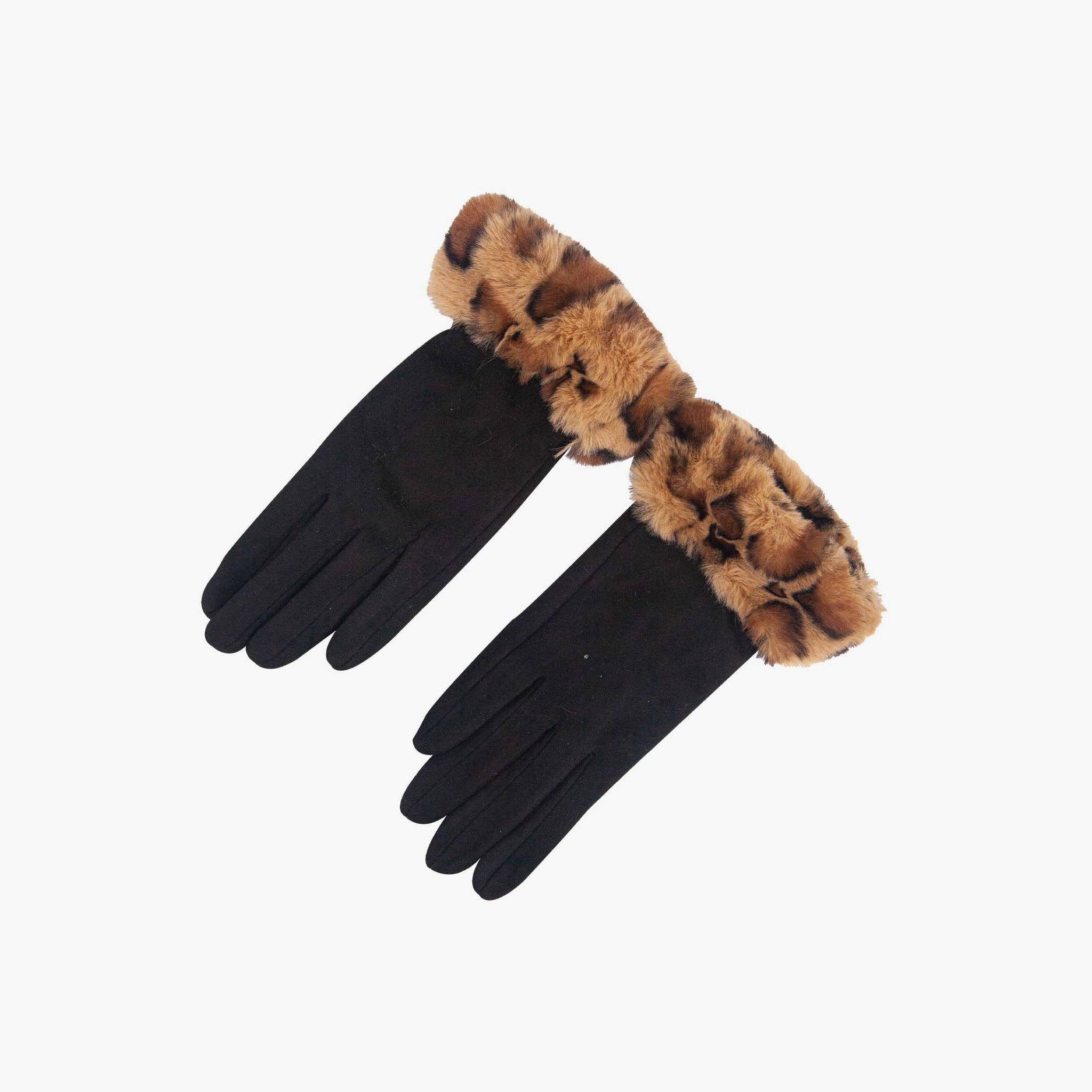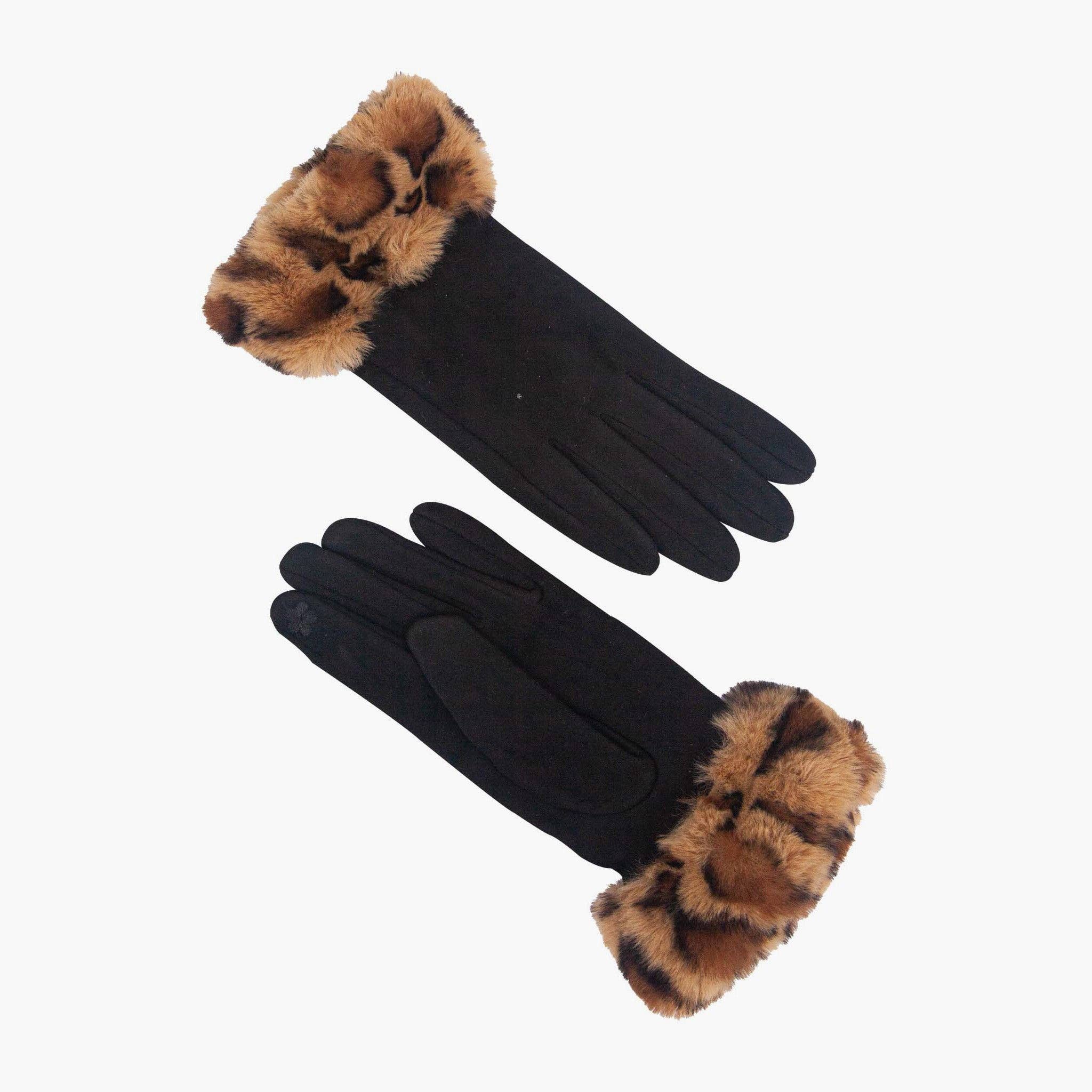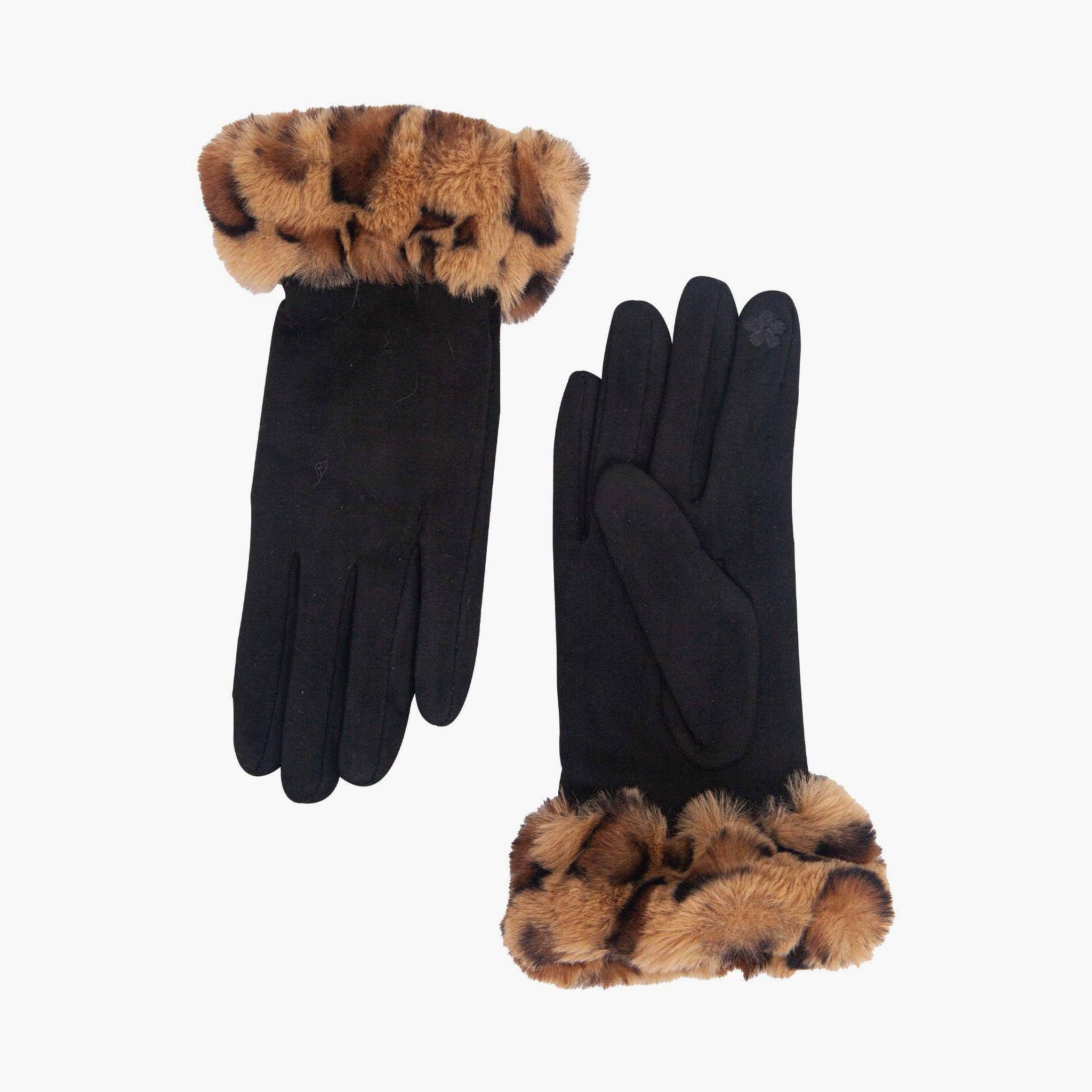 Zara Faux Fur Cuff Gloves- Black, Leopard Faux Fur