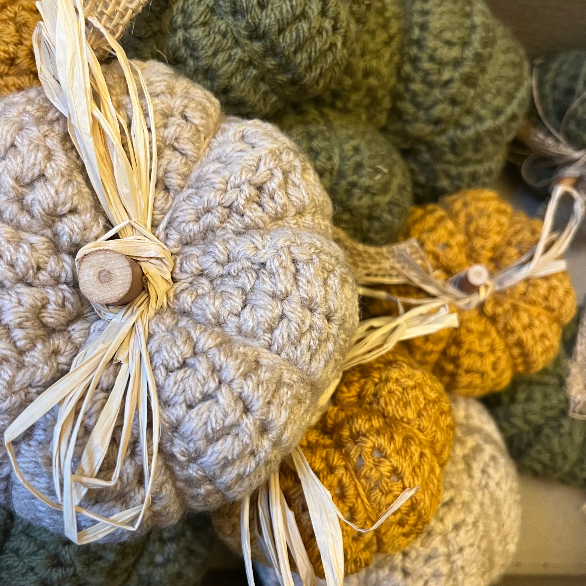Hand made crochet pumpkins with stalk and raffia. Four colours orange, mustard, taupe and green - 3 sizes