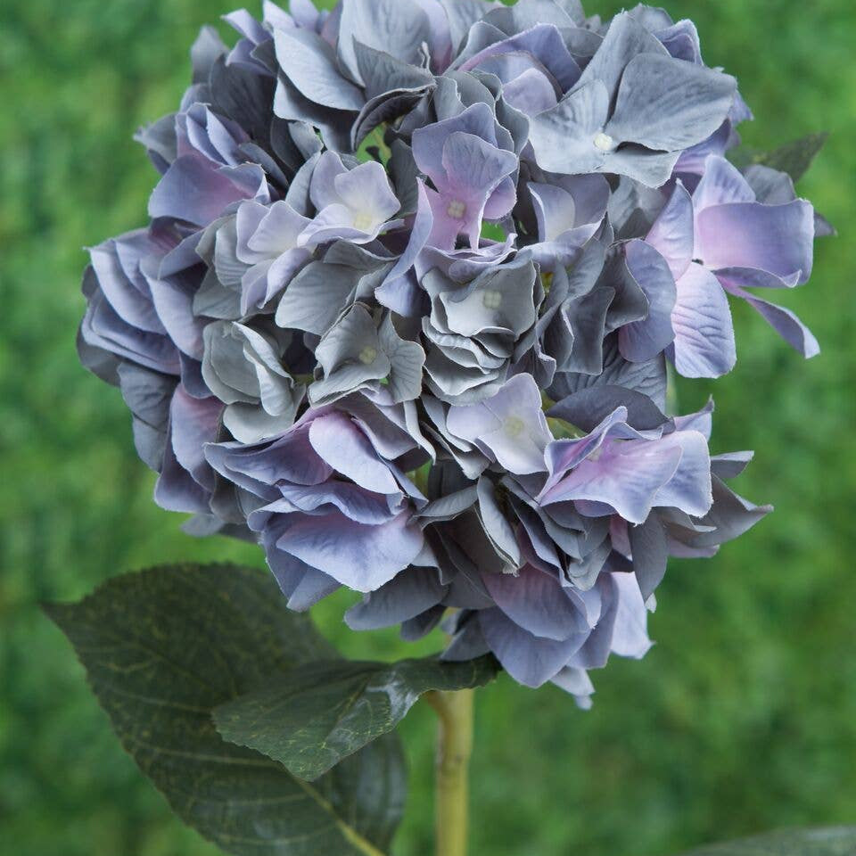 This beautiful realistic looking large silk dusky blue hydrangea with its delicate hand-crafted petals makes a bold statement in arrangements. Great mixed with other faux flowers and foliage as well as looking great on their own.